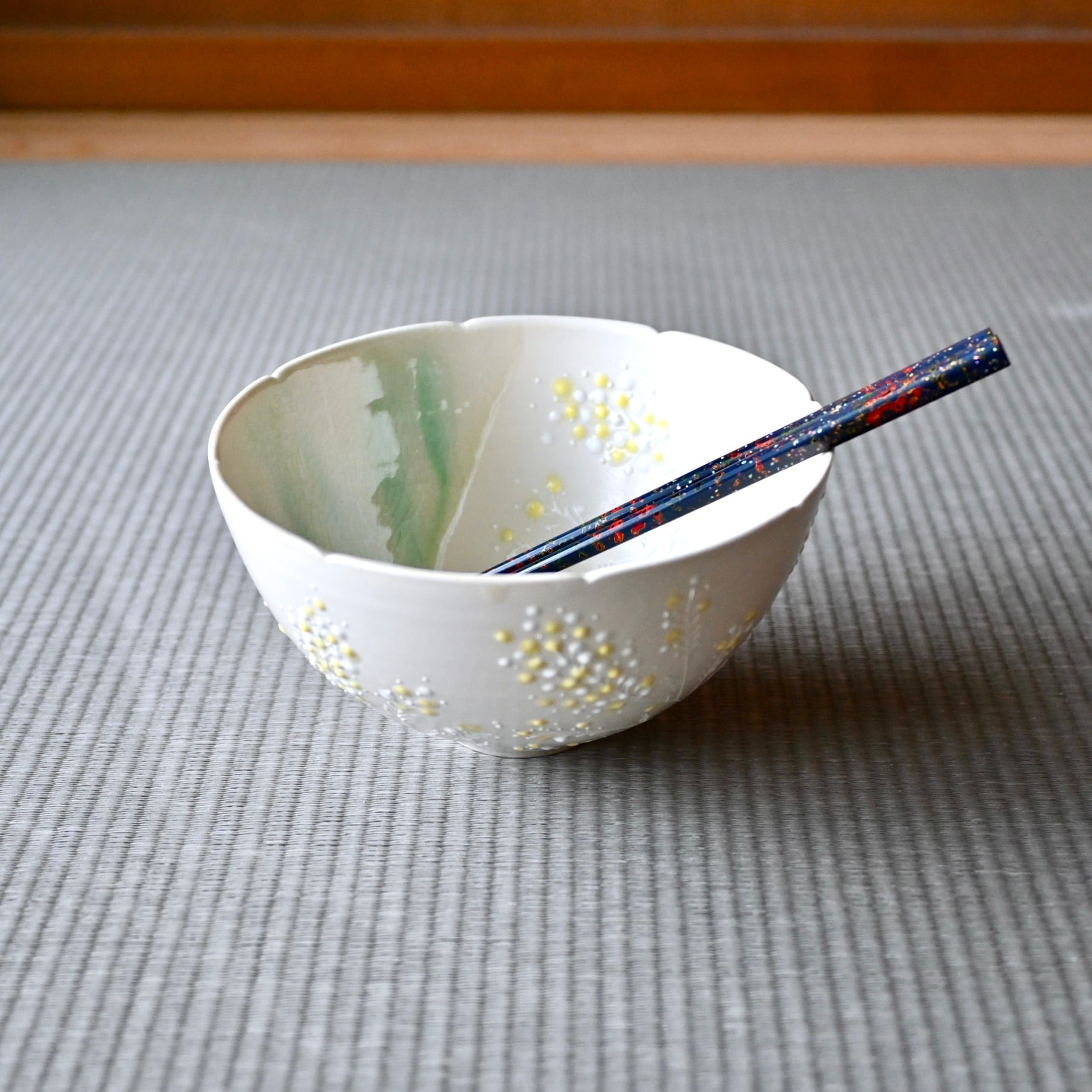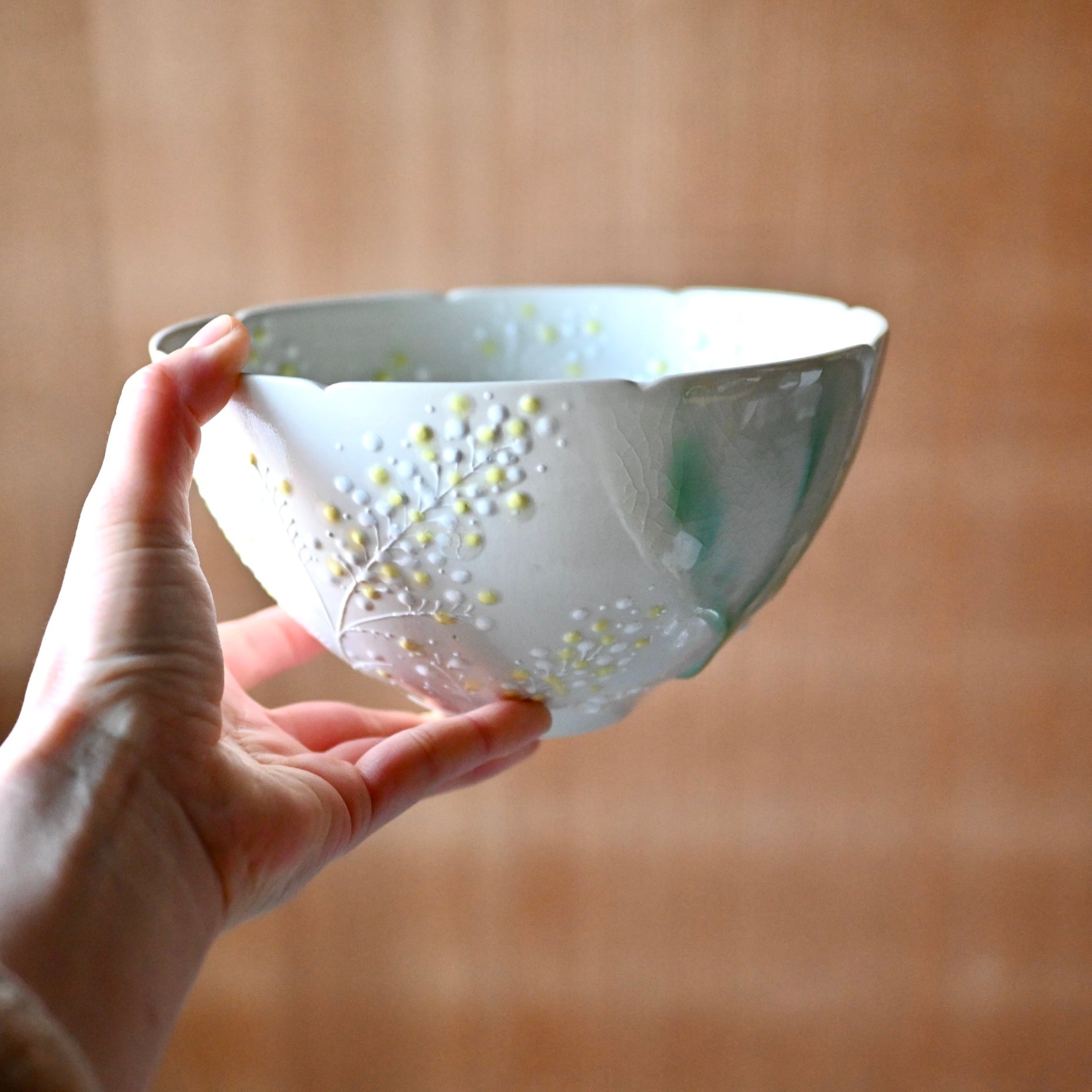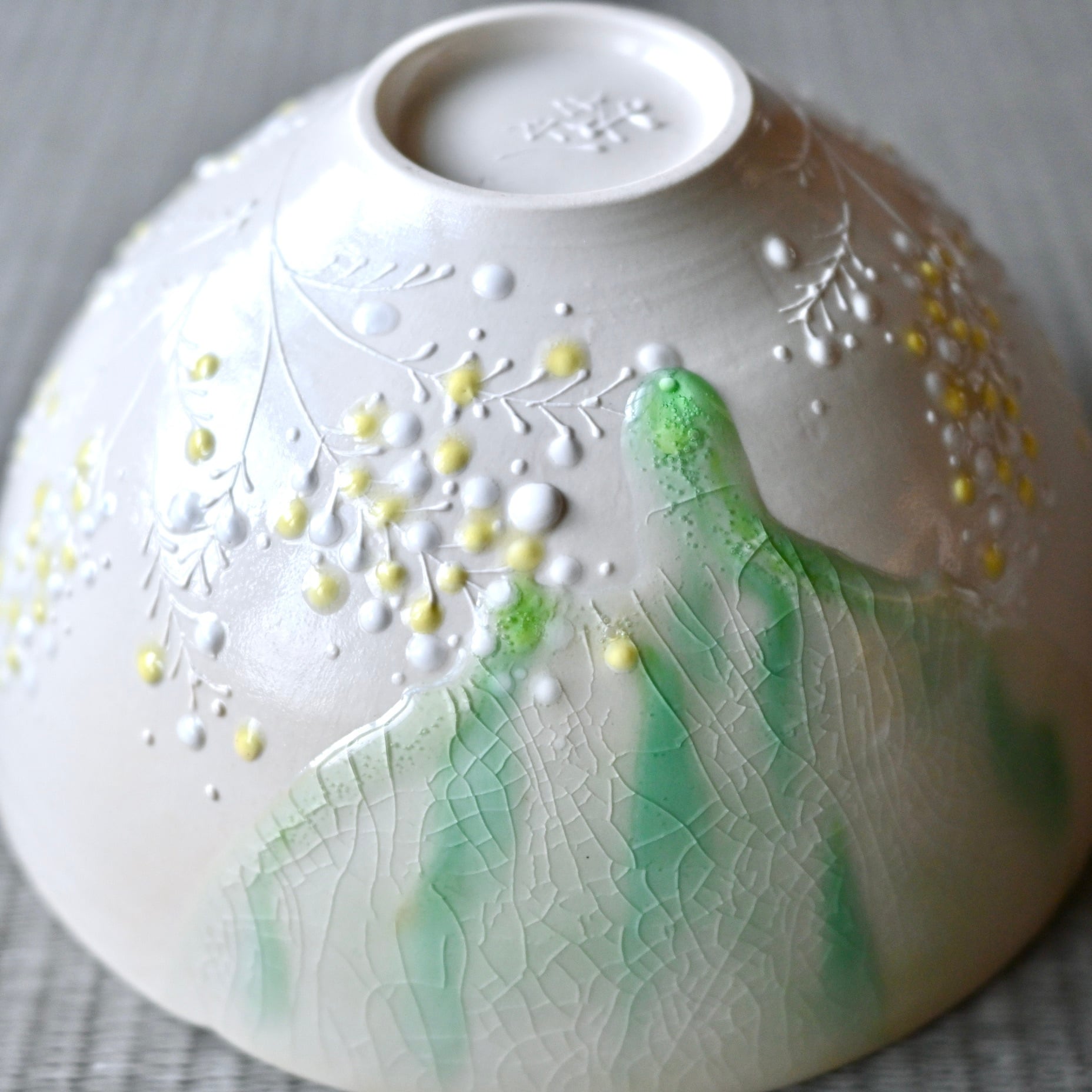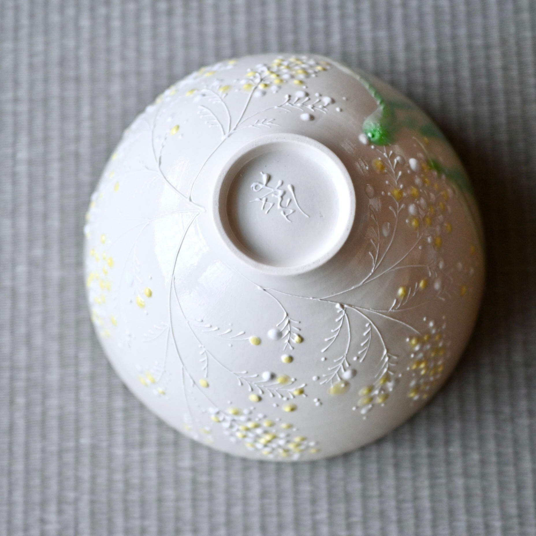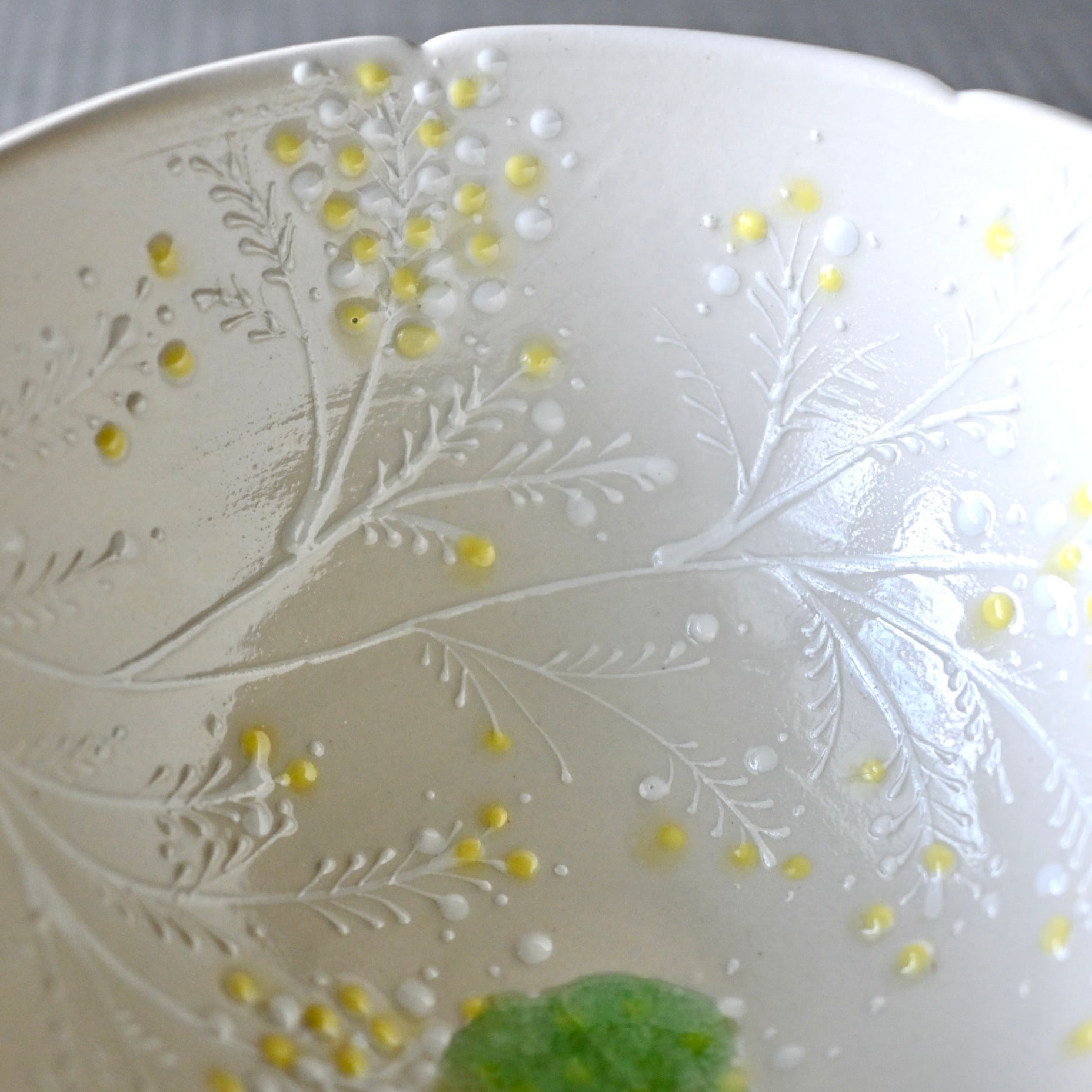 白地にミモザをイッチンと言う技法で描いたお花シリーズです。