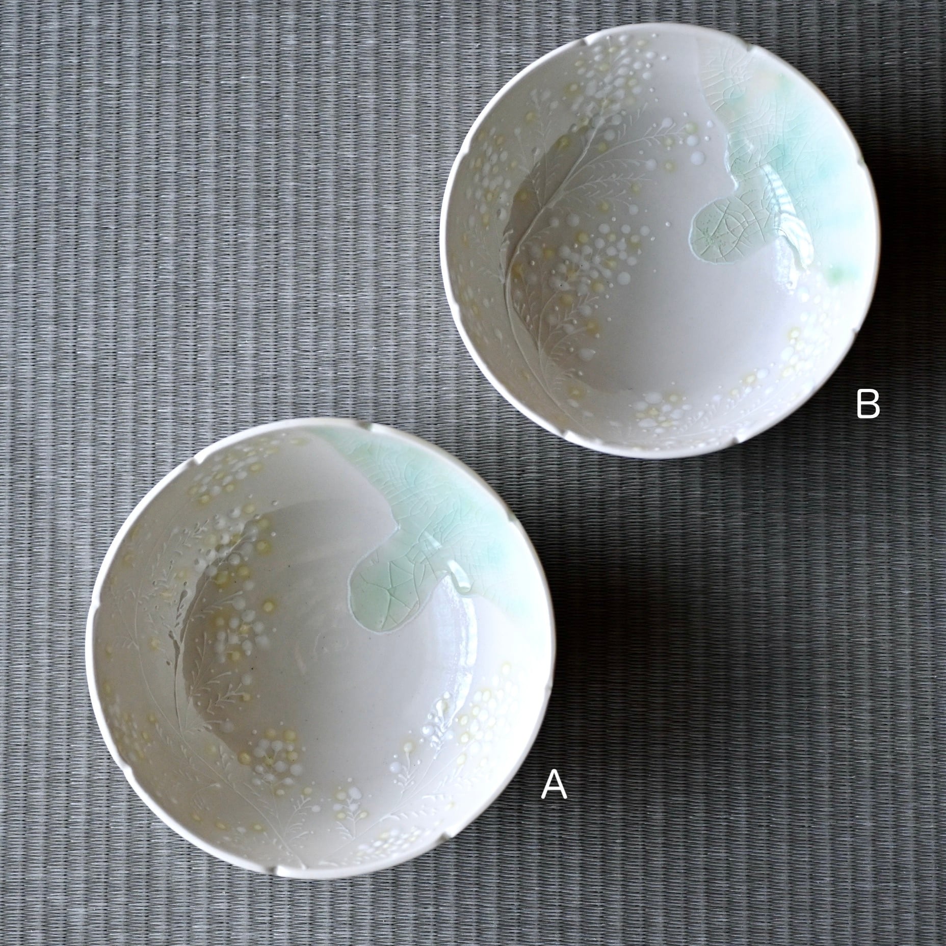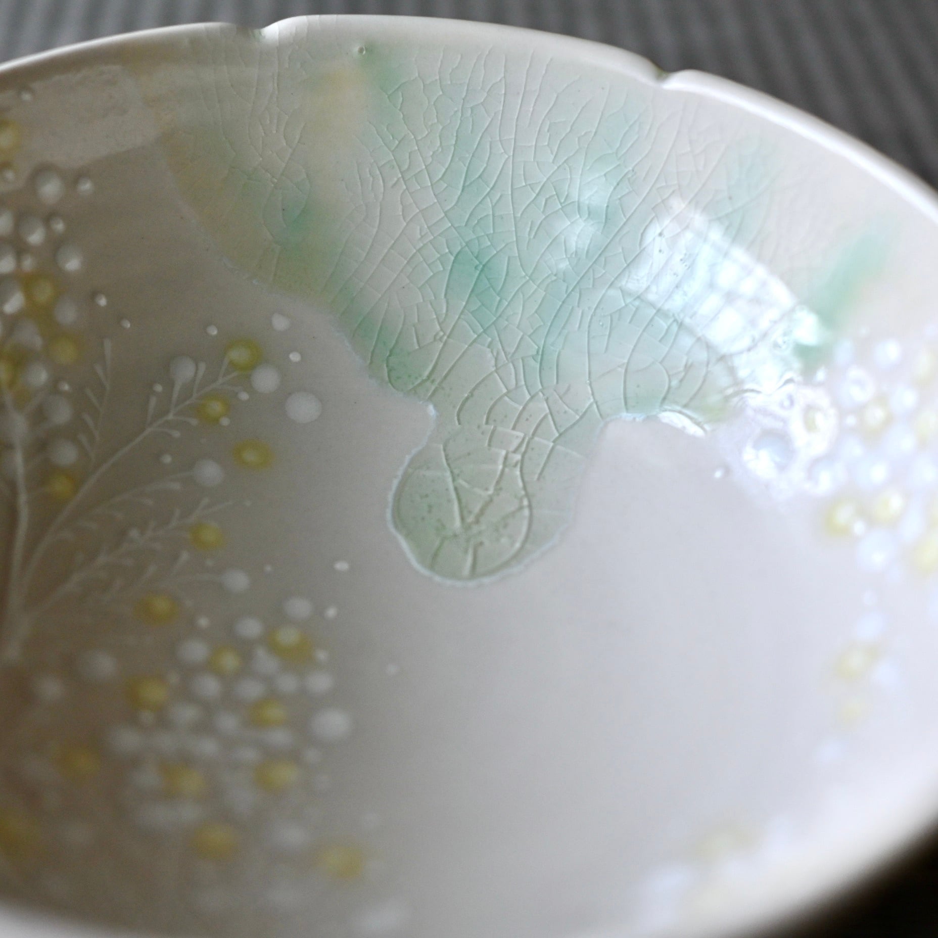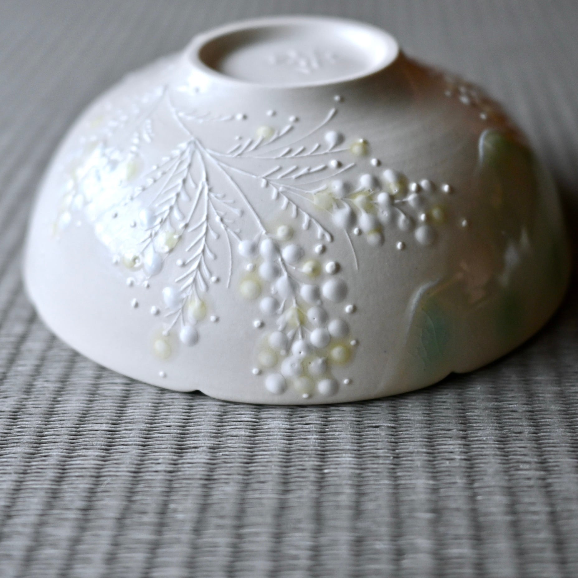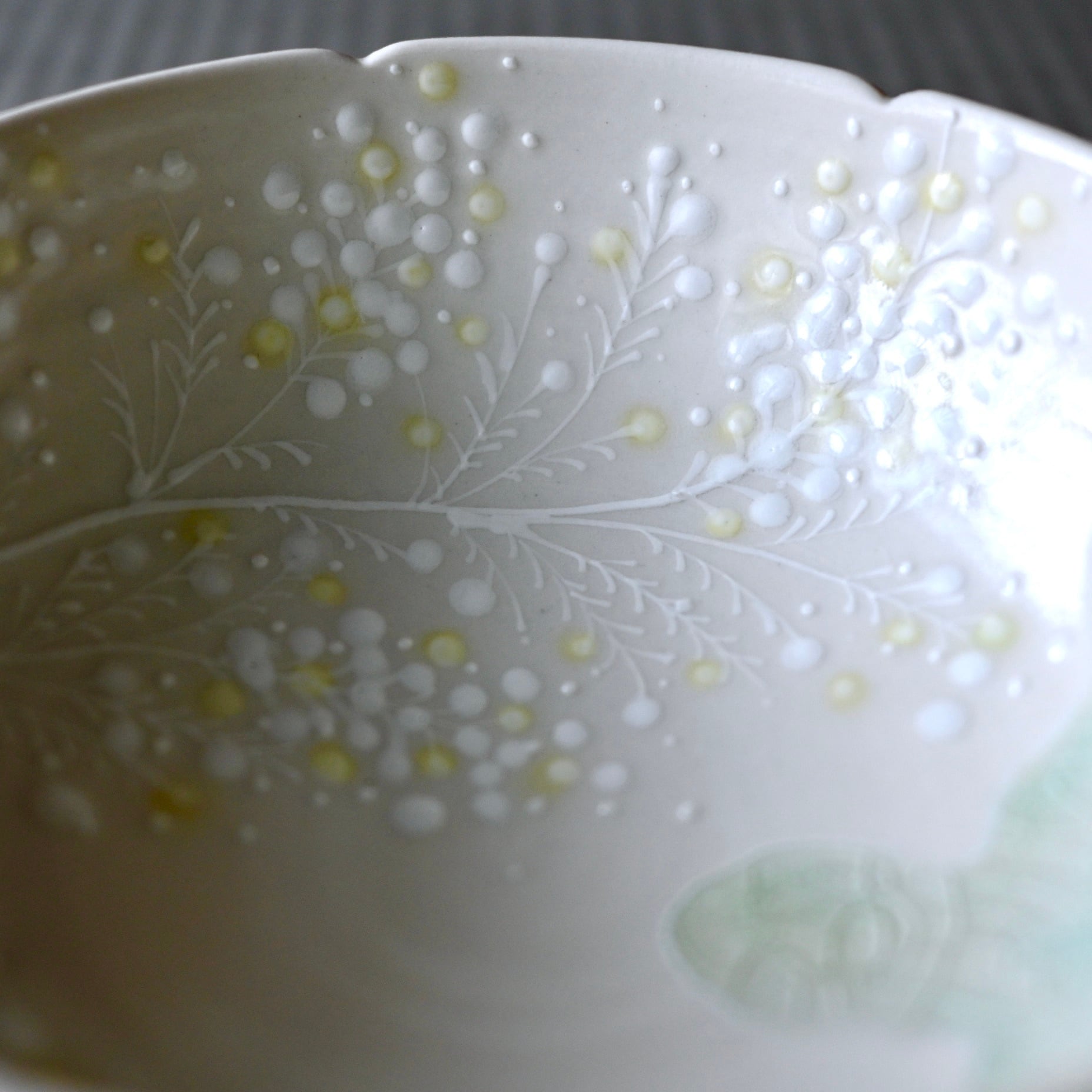 浮き立った白のミモザと、器のフチにかかったガラスの釉薬がポイントです!