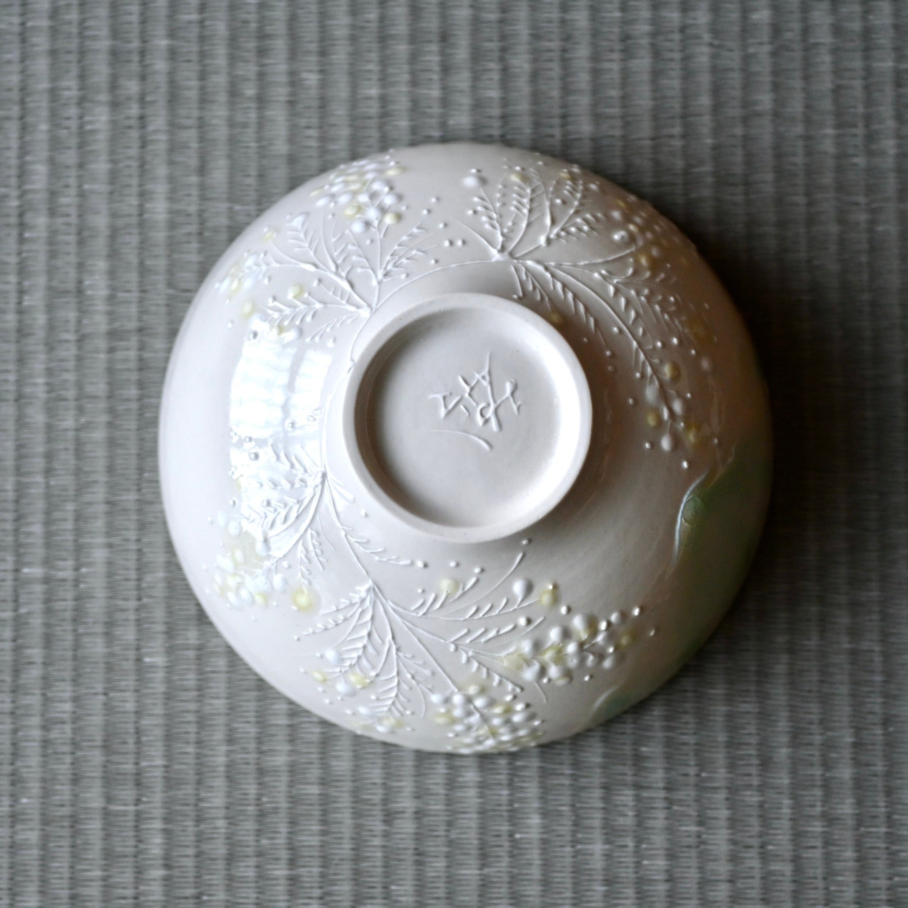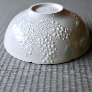白地にミモザをイッチンと言う技法で描いた、深めのボウルです。