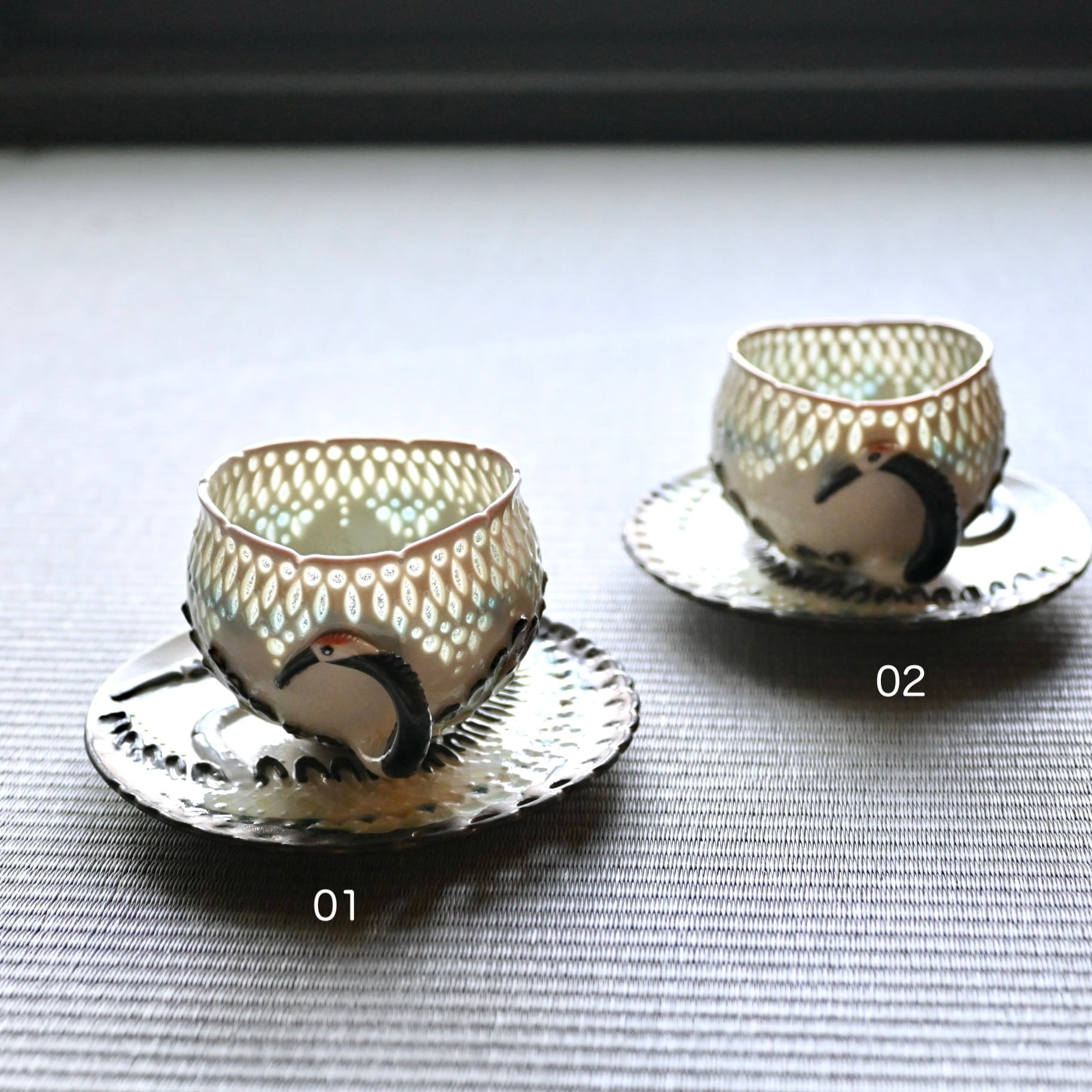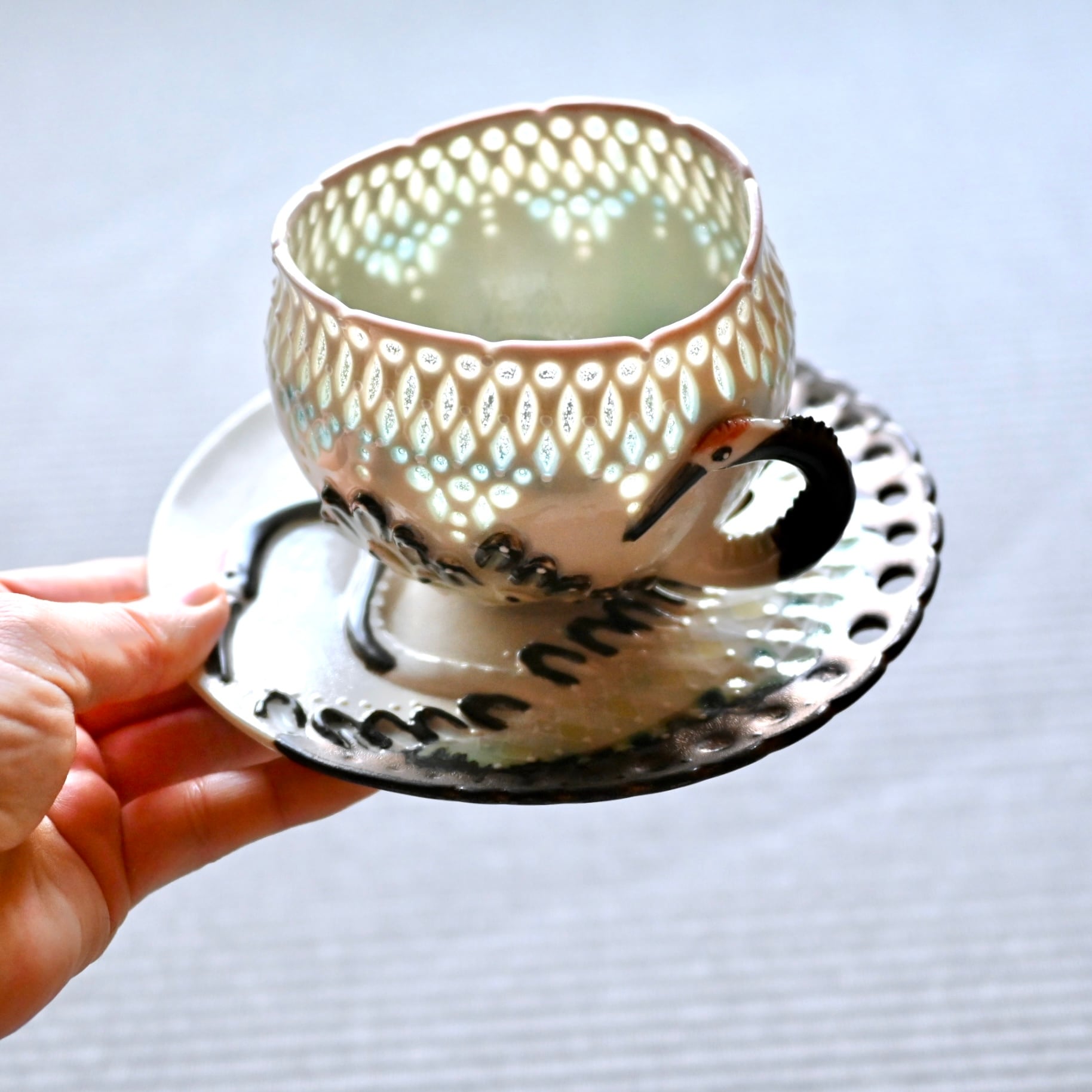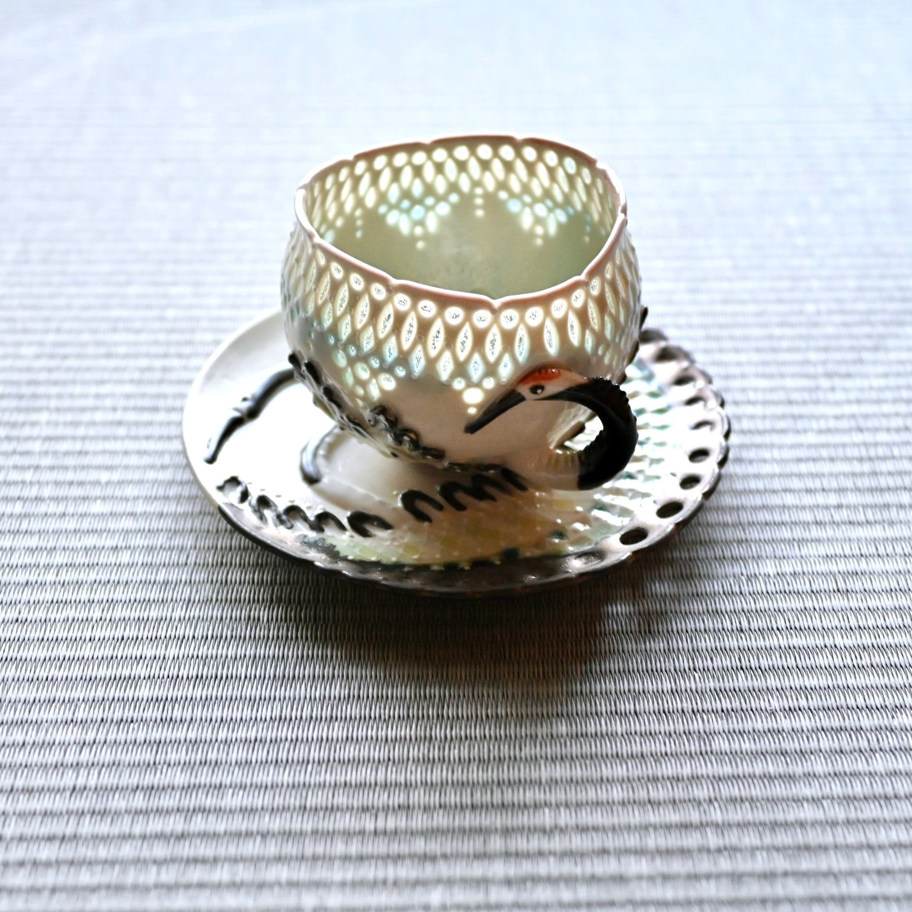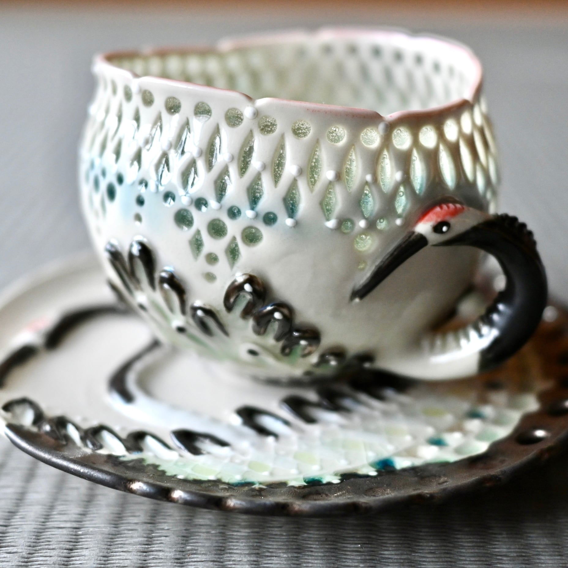 鶴の羽も一枚一枚貼って作り込んだ、華やかでゴージャスなカップです。