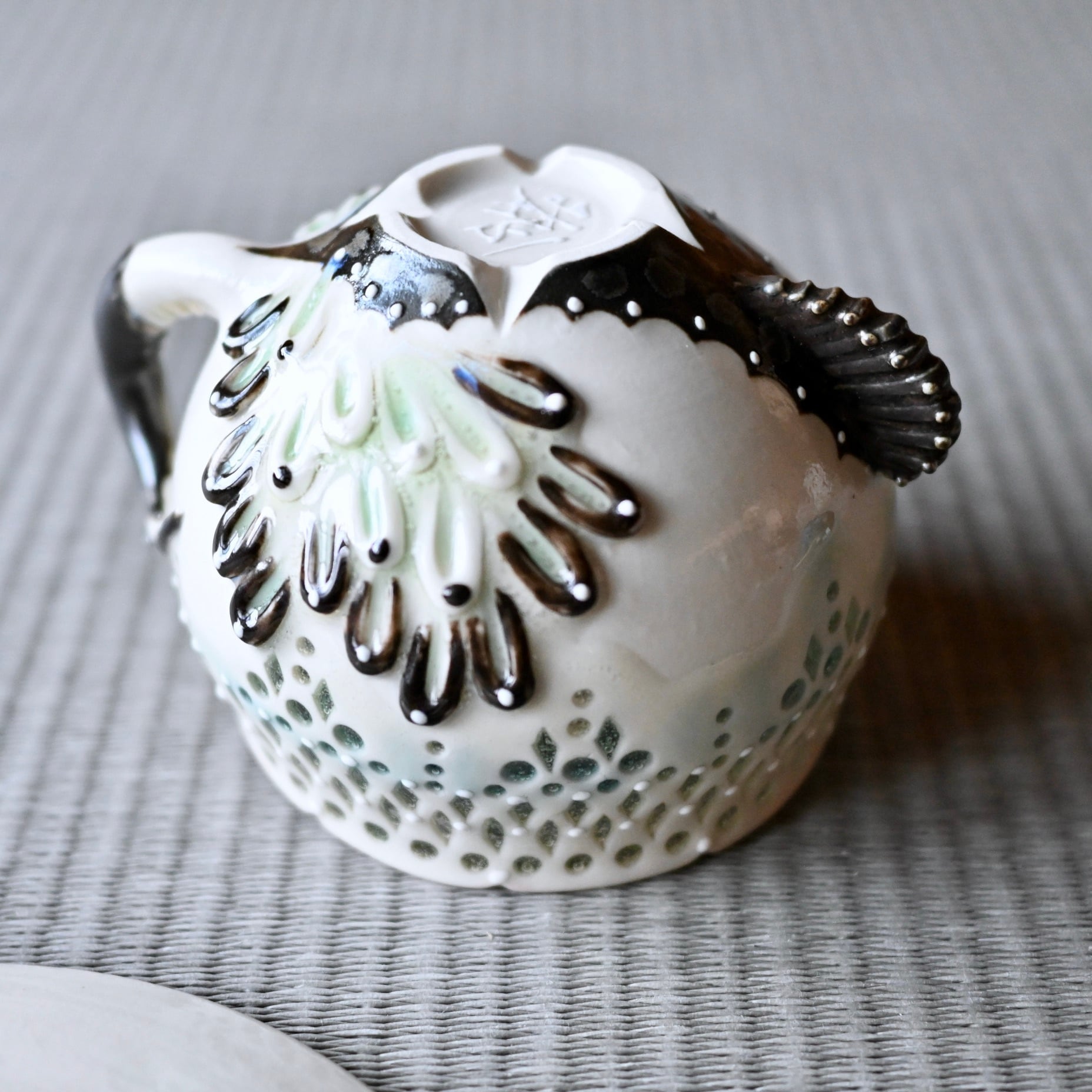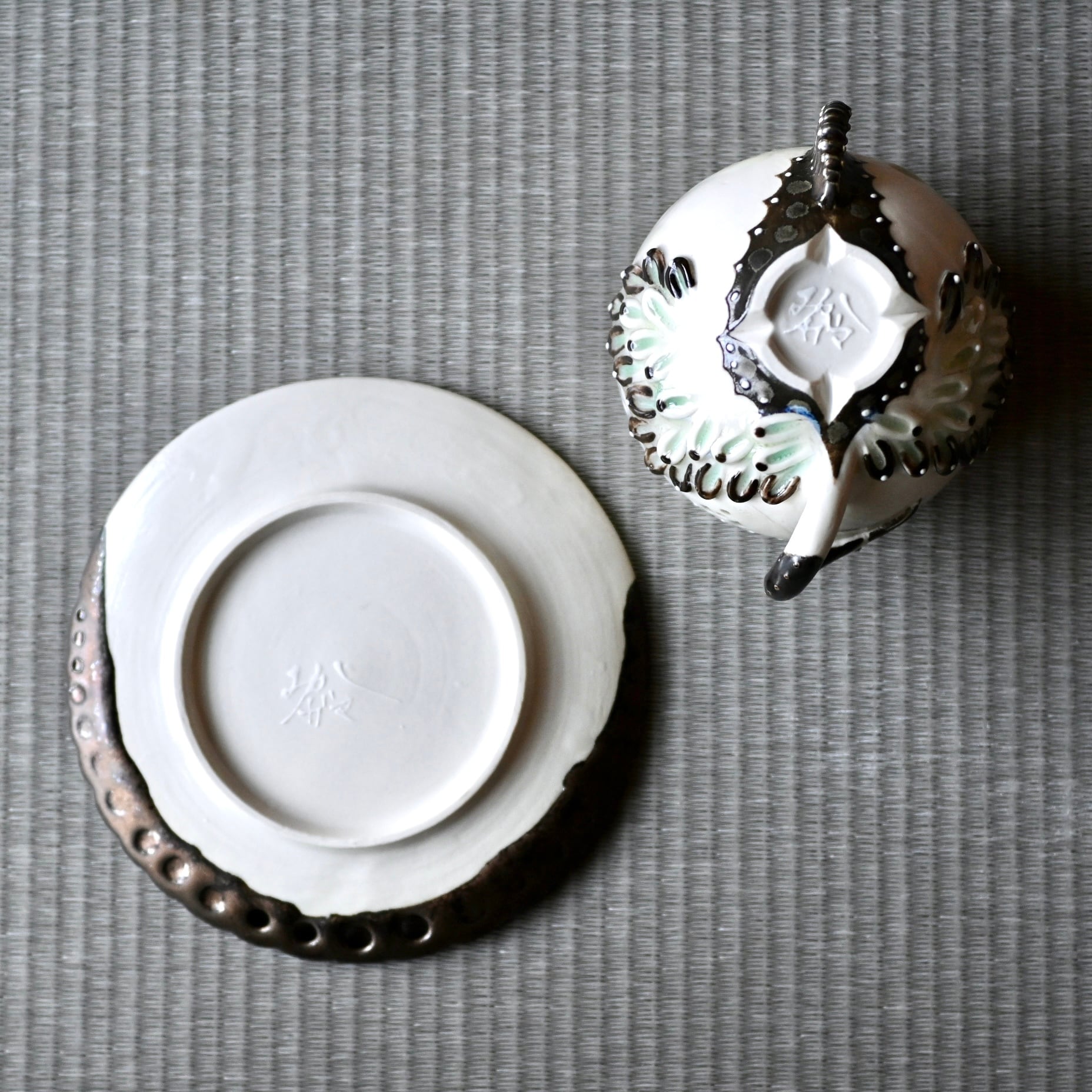 ※蛍手(ホタルデ)技法=素地を透彫(すかしぼり)にした後、透明釉を小穴に埋めて焼成する技法。 光を通して模様が浮きあがるため、蛍の光にたとえ「蛍手」と呼ばれる。