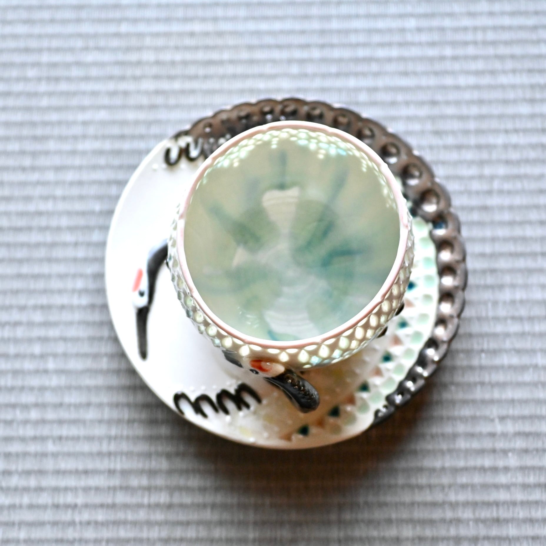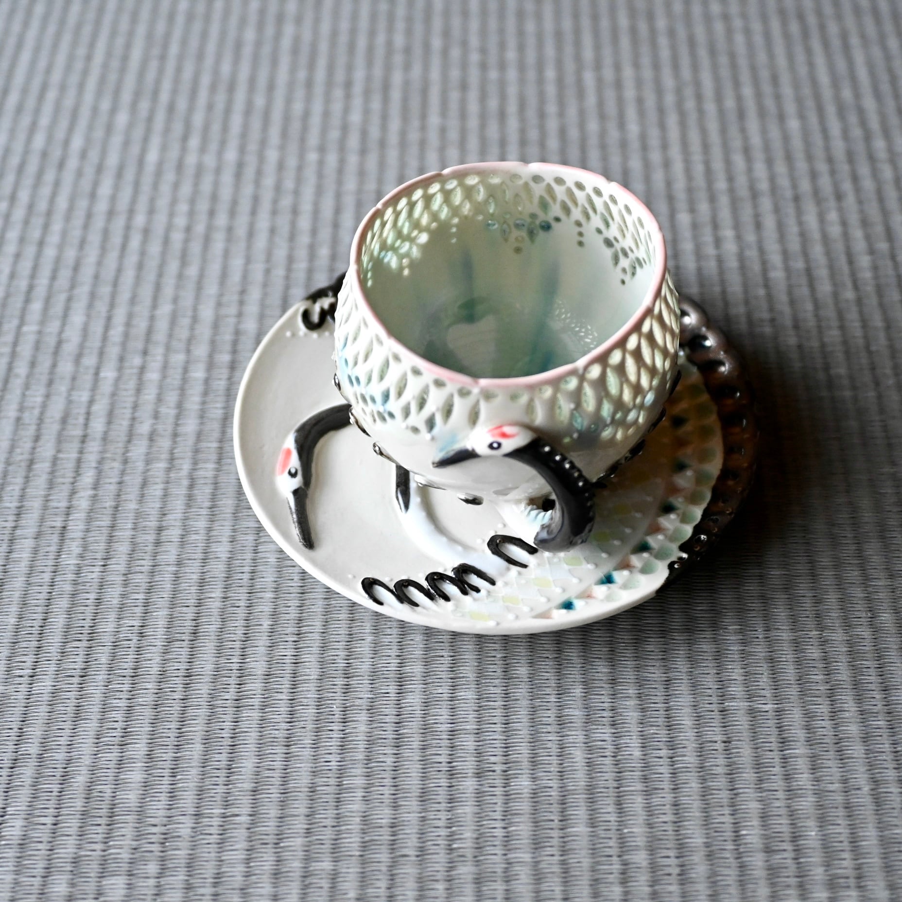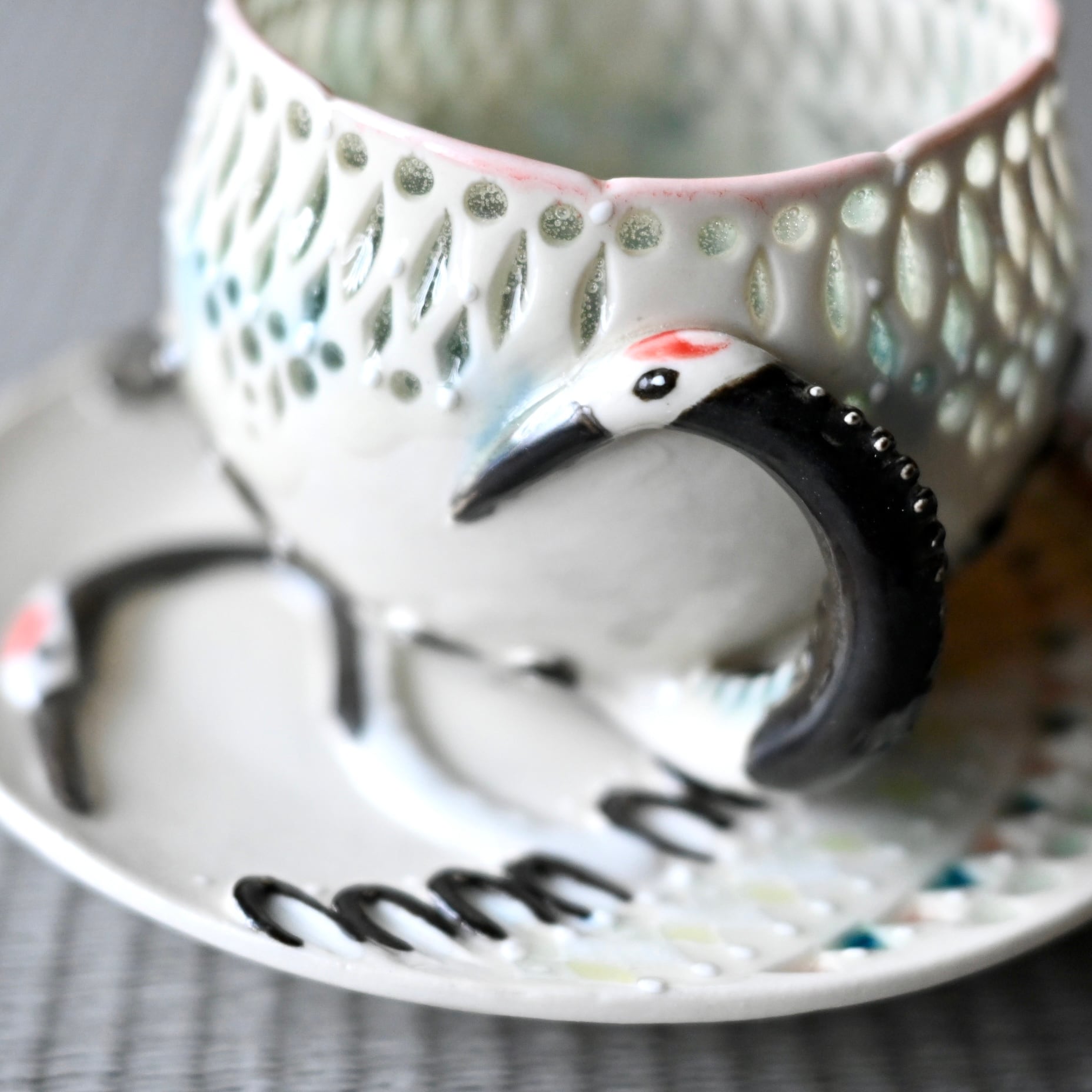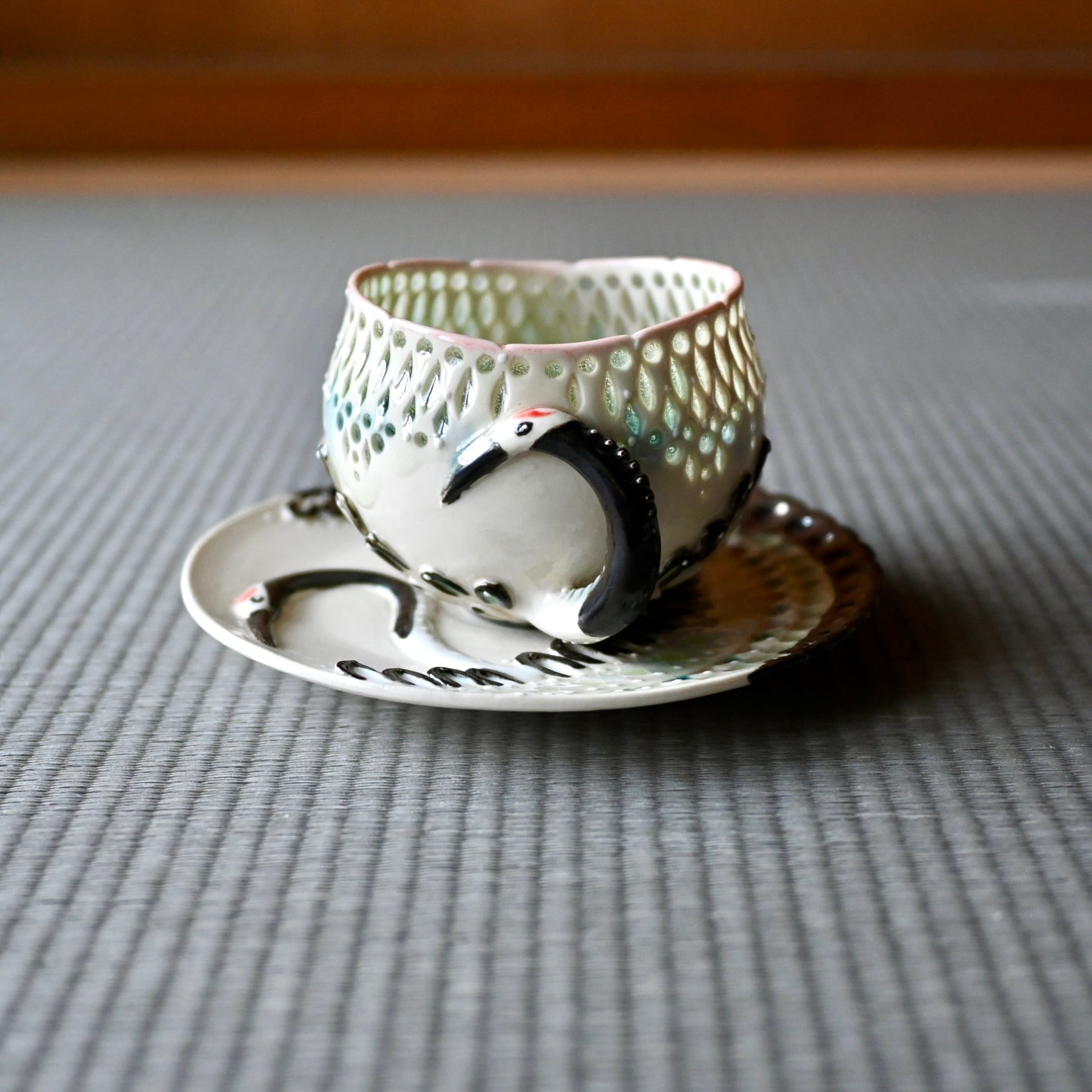 鶴の羽も一枚一枚貼って作り込んだ、華やかでゴージャスなカップです。