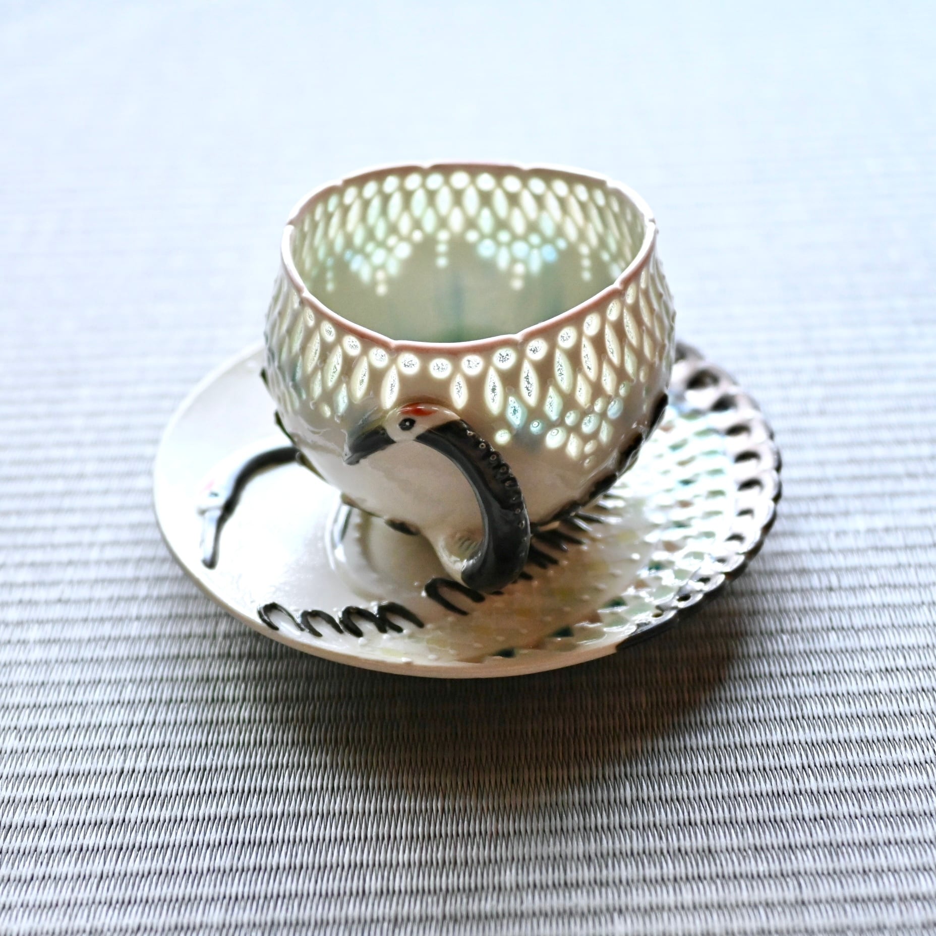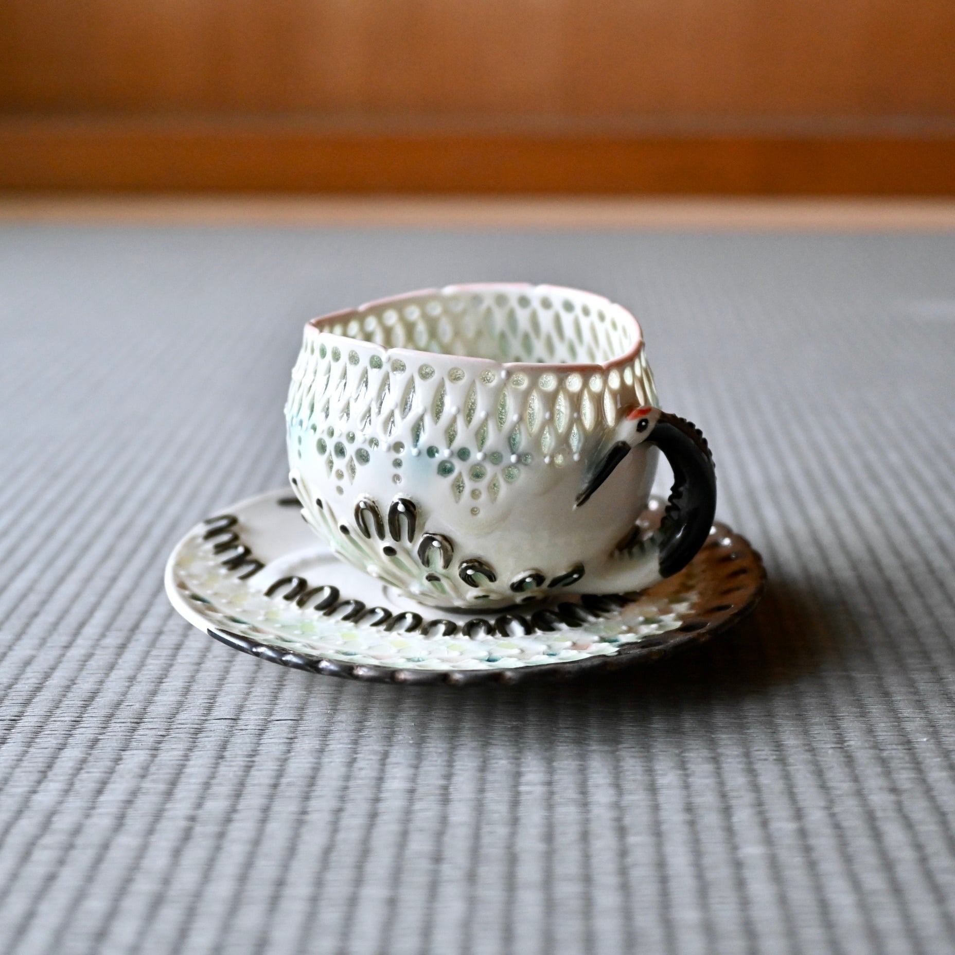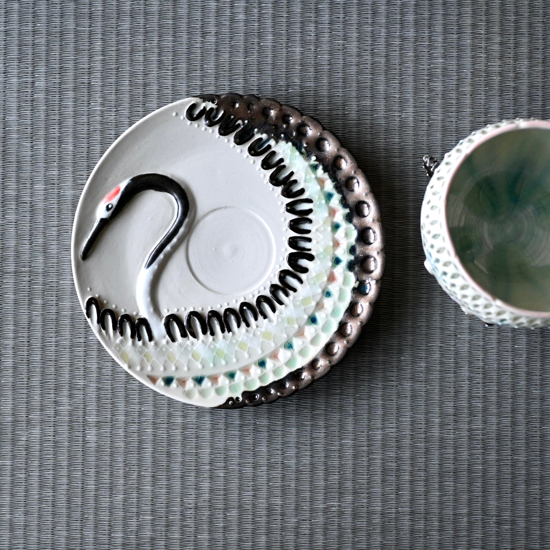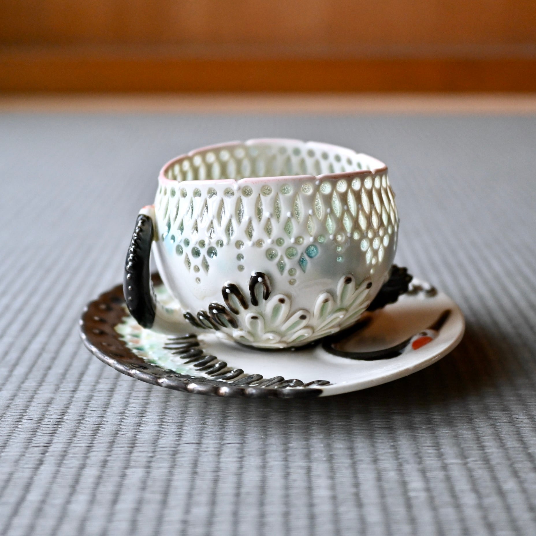 鶴の羽も一枚一枚貼って作り込んだ、華やかでゴージャスなカップです。