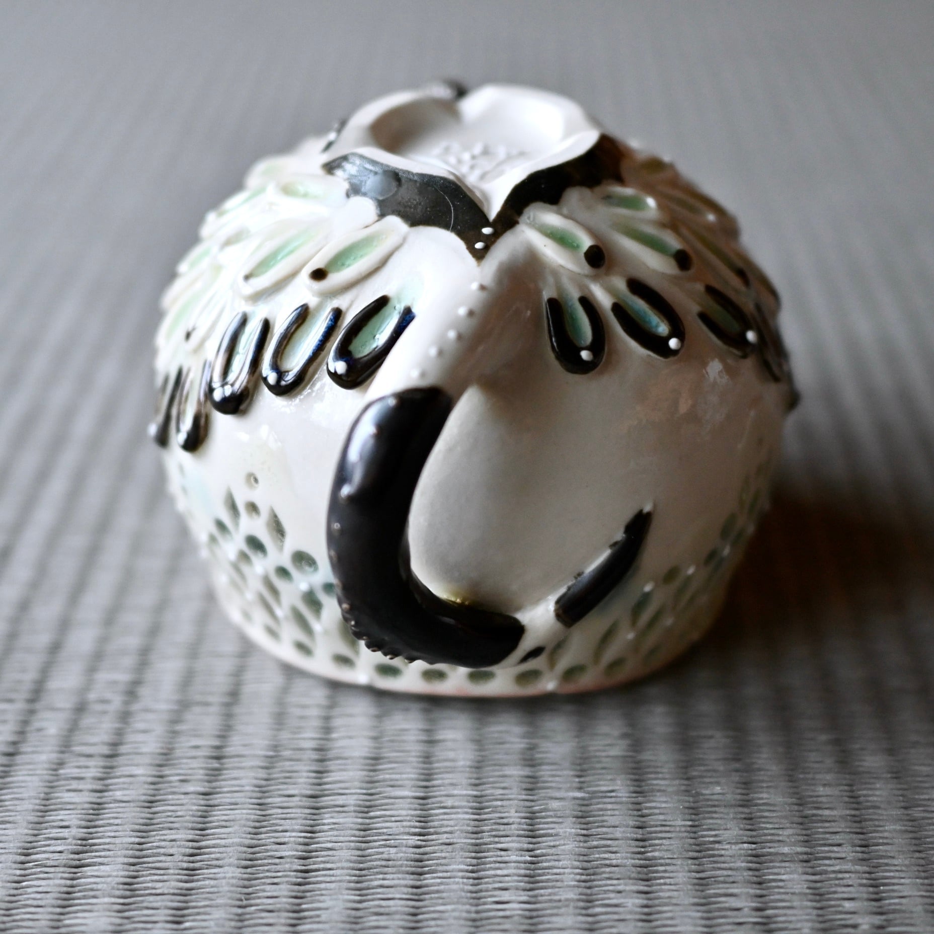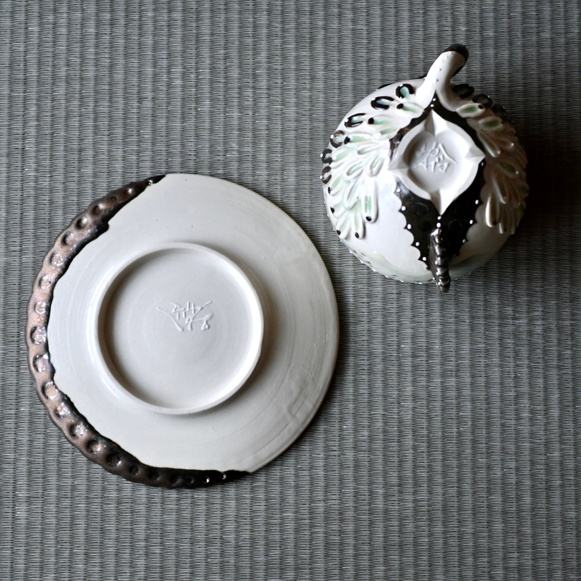 ※蛍手(ホタルデ)技法=素地を透彫(すかしぼり)にした後、透明釉を小穴に埋めて焼成する技法。 光を通して模様が浮きあがるため、蛍の光にたとえ「蛍手」と呼ばれる。