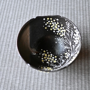 黒地に白のミモザをイッチンと言う技法で描いた、シックな大人ミモザシリーズのぐい呑みです。