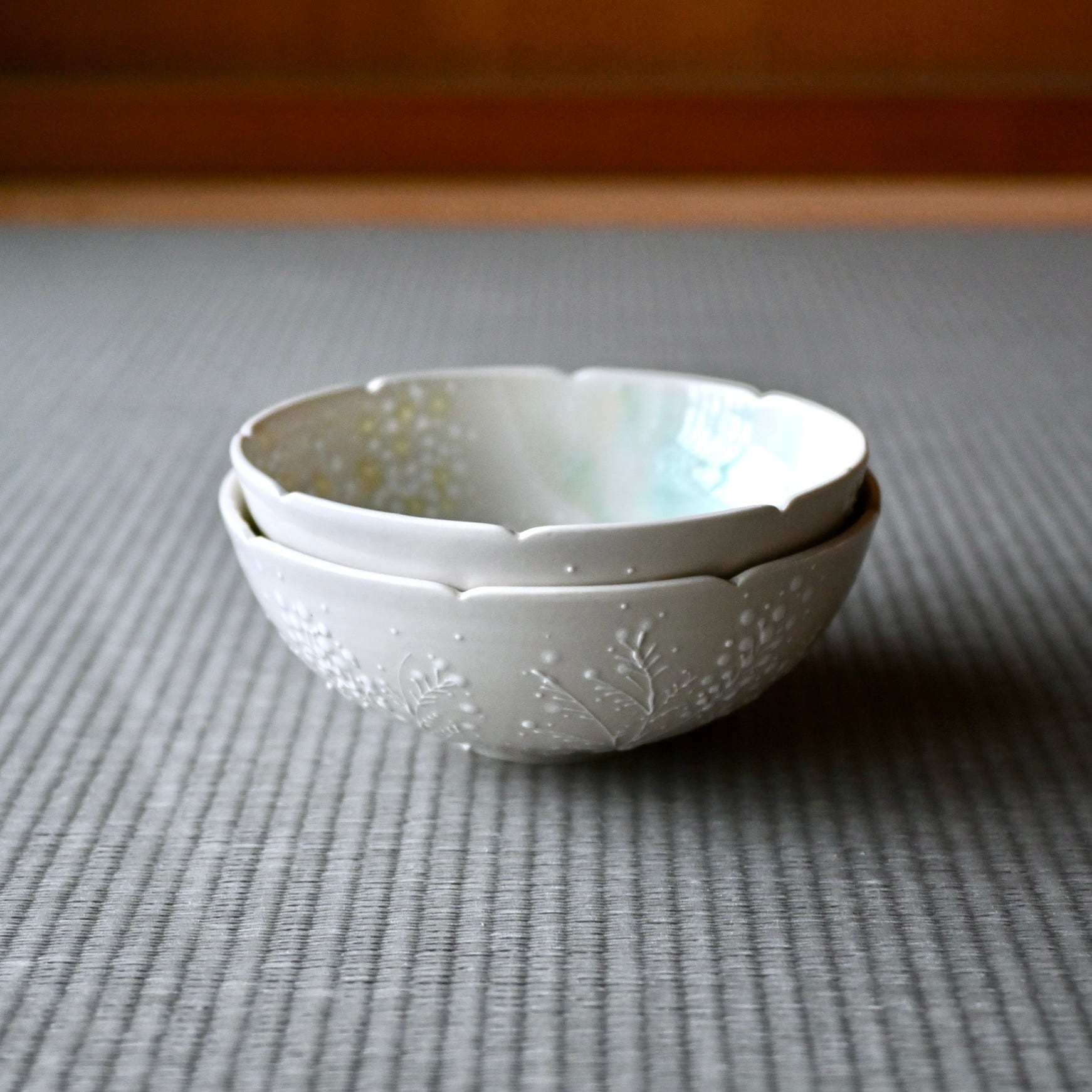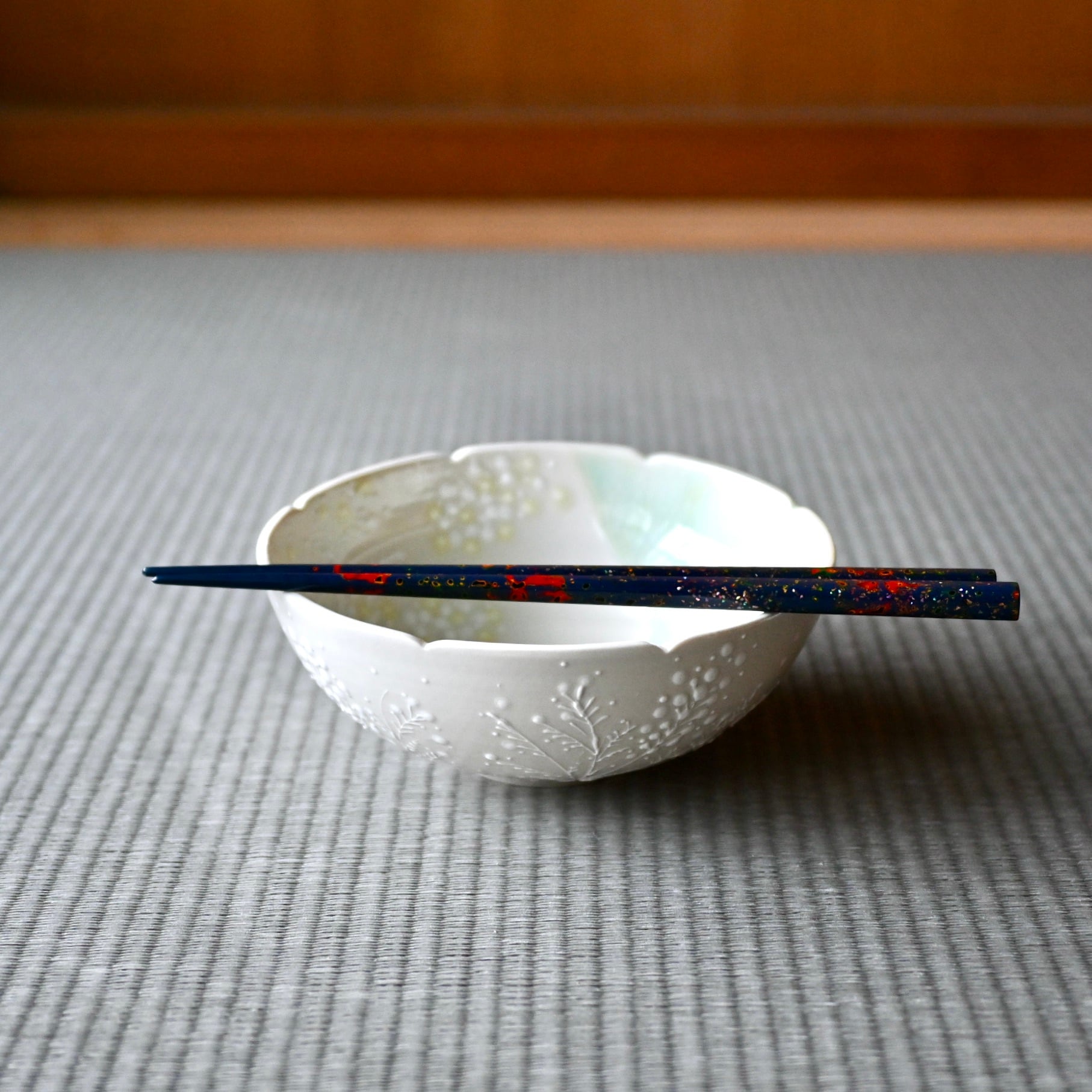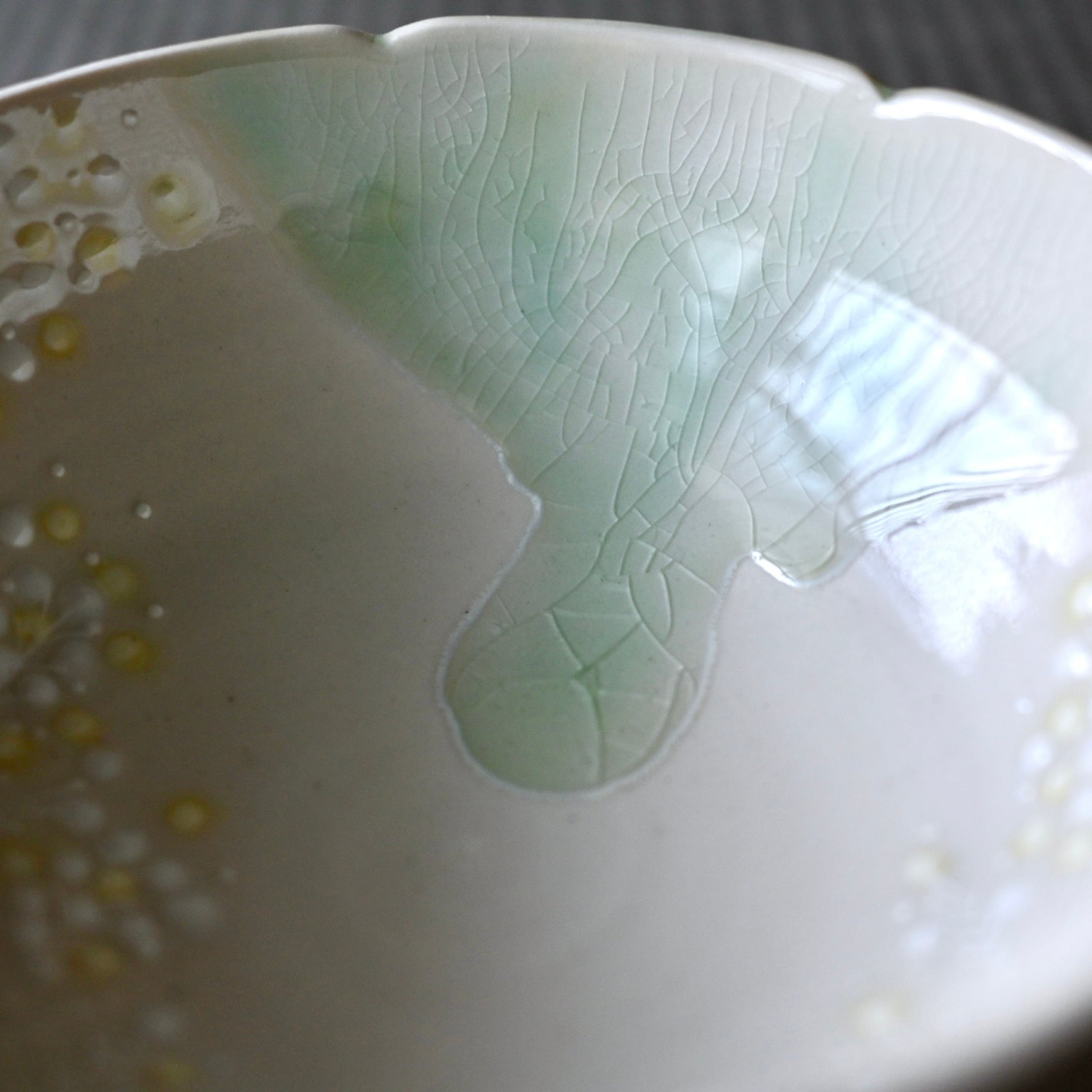 浮き立った白のミモザと、器のフチにかかったガラスの釉薬がポイントです!
