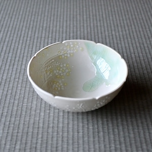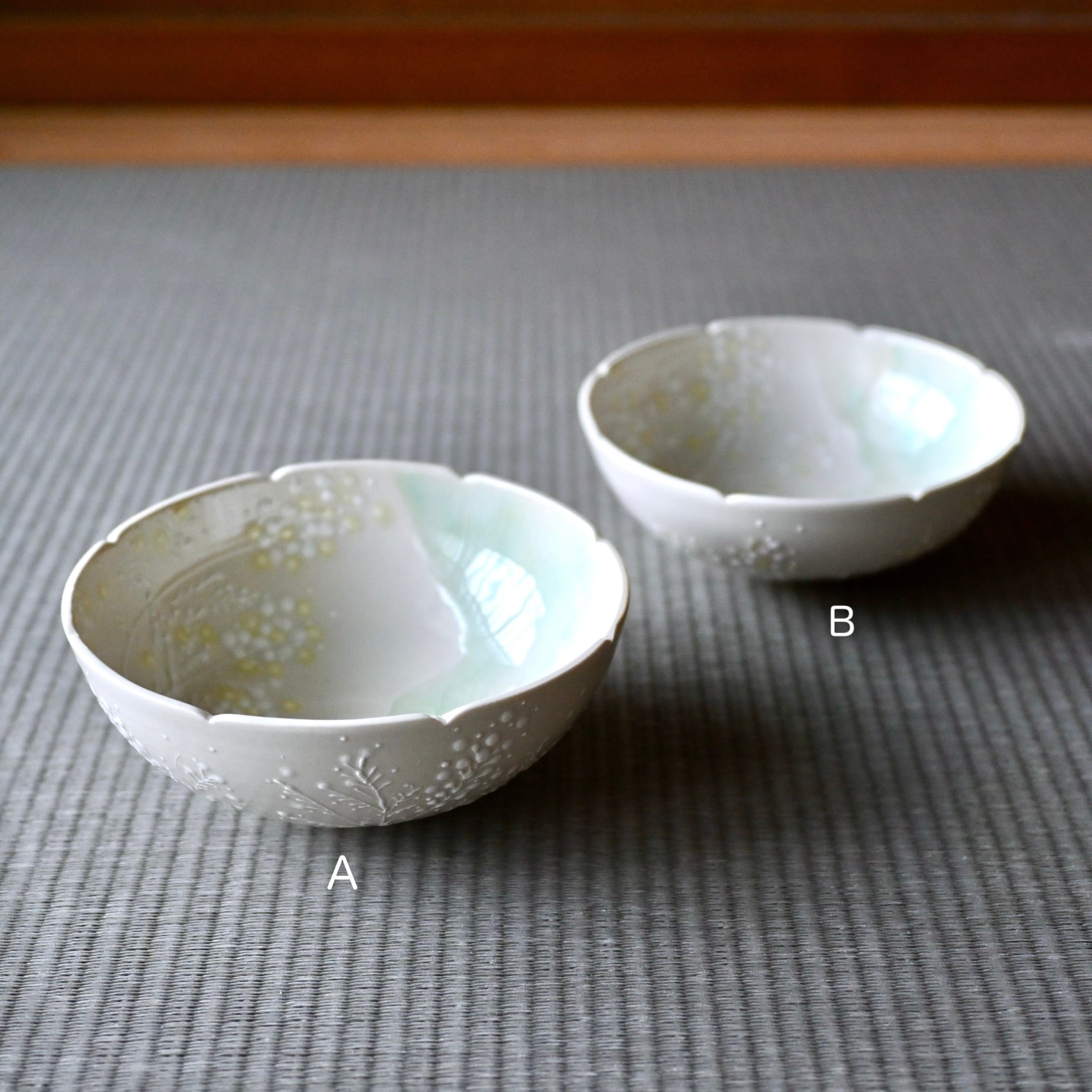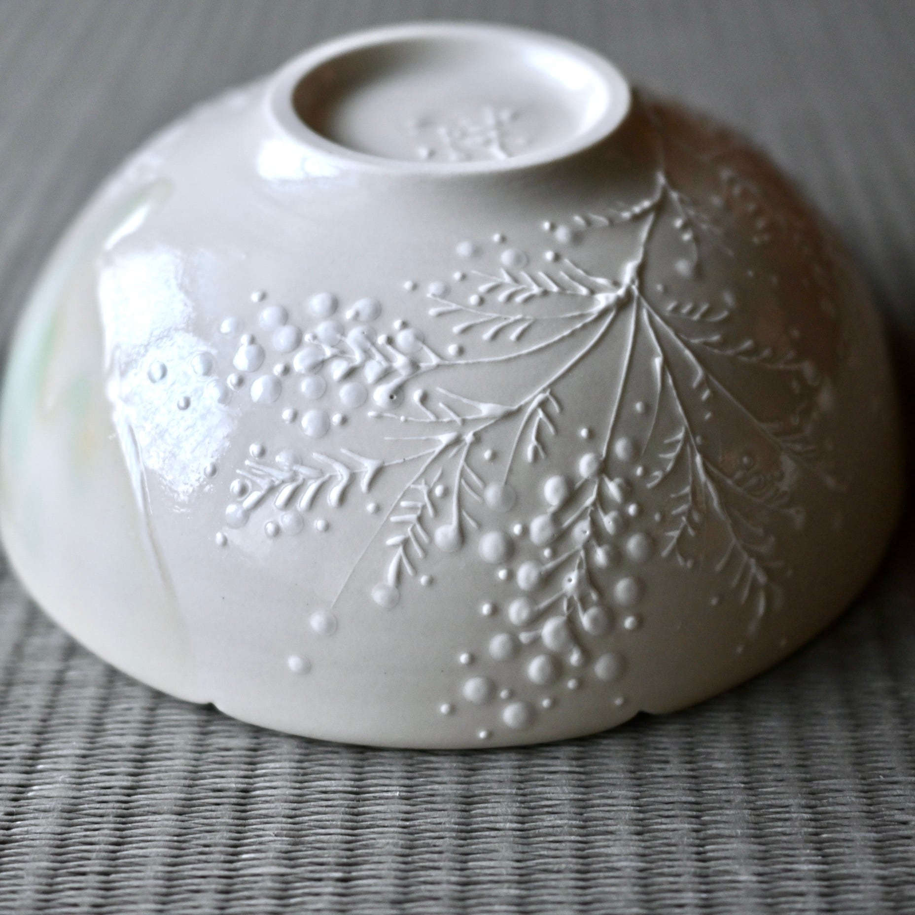 白地にミモザをイッチンと言う技法で描いた、深めのボウルです。
